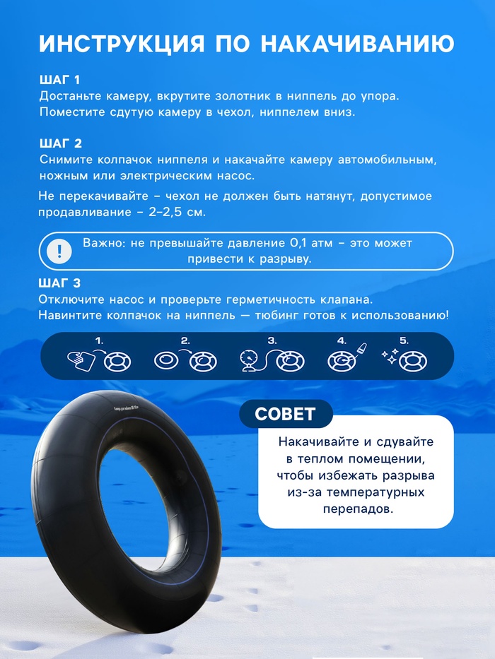 - Важно! После катания на морозе обязательно частично или полностью стравите воздух через ниппель во избежание повреждений из-за расширения воздуха при нагреве в теплом помещении.