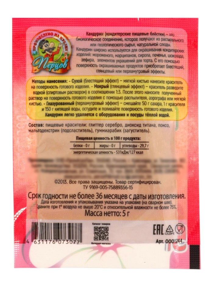 - Экономичный расход: Вес упаковки всего 5 граммов, но этого количества хватит на декорирование 20–30 яиц или большой партии капкейков. Порошок очень лёгкий, для покрытия требуется минимальное количество.
