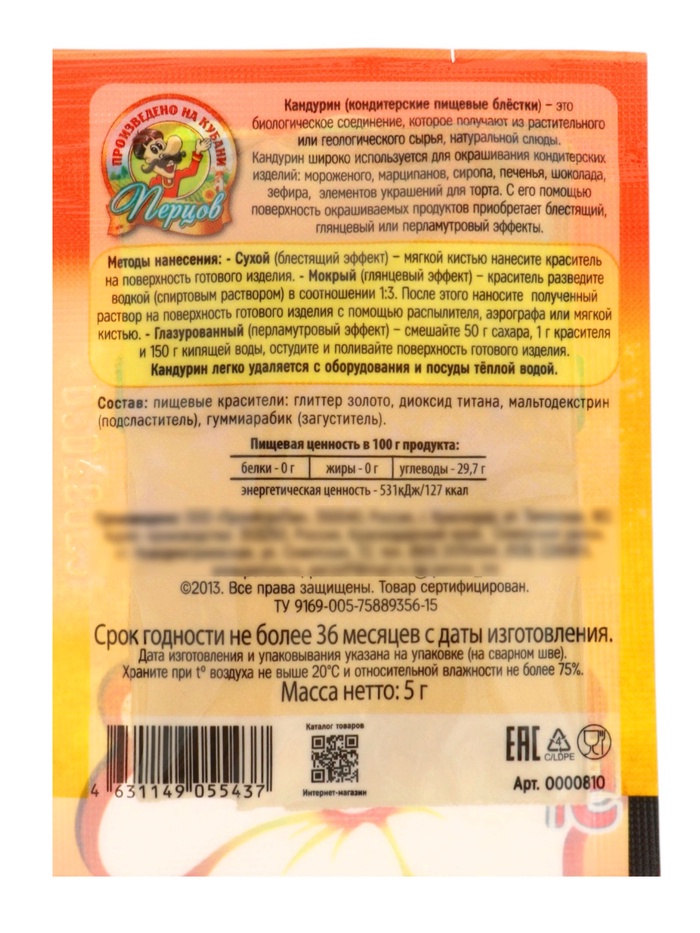Королевский блеск для пасхальных яиц. Кандурин золотой (5 г) — это пищевые блёстки с эффектом драгоценного металла. Мелкодисперсный порошок превращает обычную яичную скорлупу в поверхность, напоминающую золото. Никакого вкуса или запаха, только роскошный внешний вид для праздничного стола.