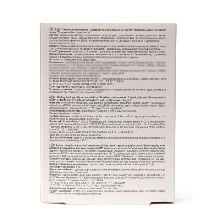 Состав: трикальция фосфат, глюкозамина гидрохлорид, хондроитина сульфат, желатин*, метилсульфонилметан (МСМ), кальциевая соль стеариновой кислоты (Е470, антислеживающий агент), аэросил (диоксид кремния, Е551, антислеживающий агент), диоксид титана