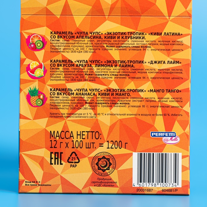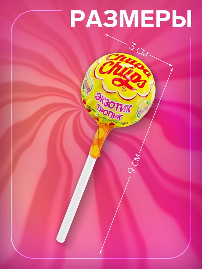 100 штук карамели на палочке Chupa Chups Экзотик-Тропик в одном шоубоксе станут отличным дополнением к любому событию, их можно брать в гости или дарить друзьям. Зарядитесь весельем вместе с карамелью Chupa Chups Экзотик-Тропик!