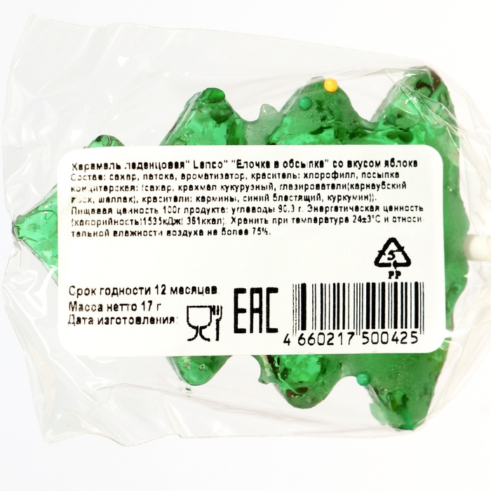 Состав: сахар, патока, ароматизатор, краситель: хлорофилл, посыпка кондитерская: (сахар, крахмал кукурузный, глазирователи (карнаубский воск, шеллак), красители: кармины, синий блестящий, куркумин).