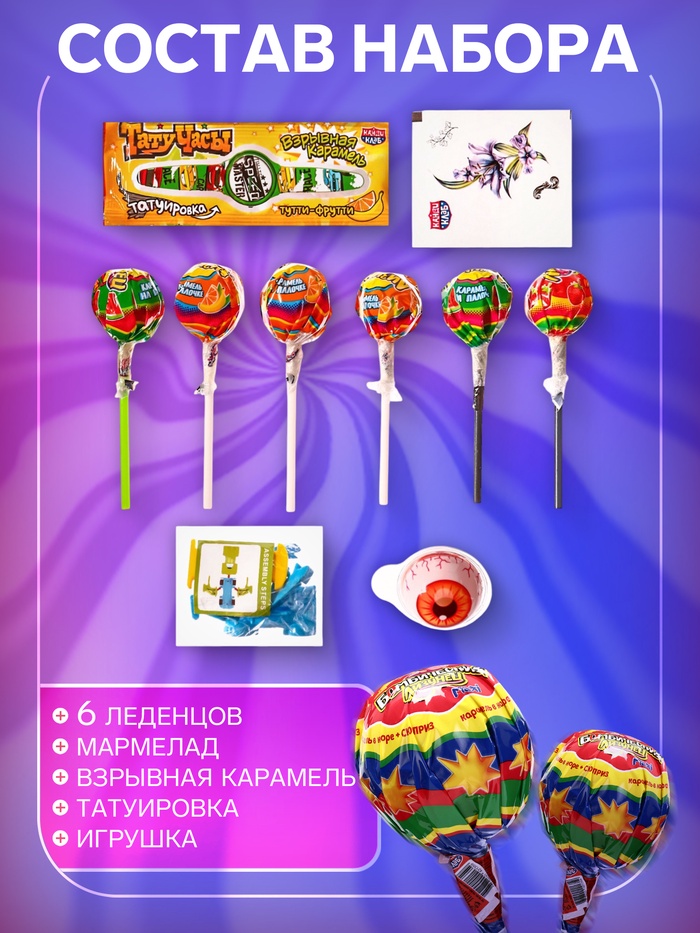 Объёмный леденец обеспечивает продолжительное наслаждение вкусом. В комплекте содержатся небольшие подарки для дополнительной радости. Идеален для детских праздников, перекусов и тематических наборов. Привлекательная упаковка подчёркивает индивидуальность продукта.