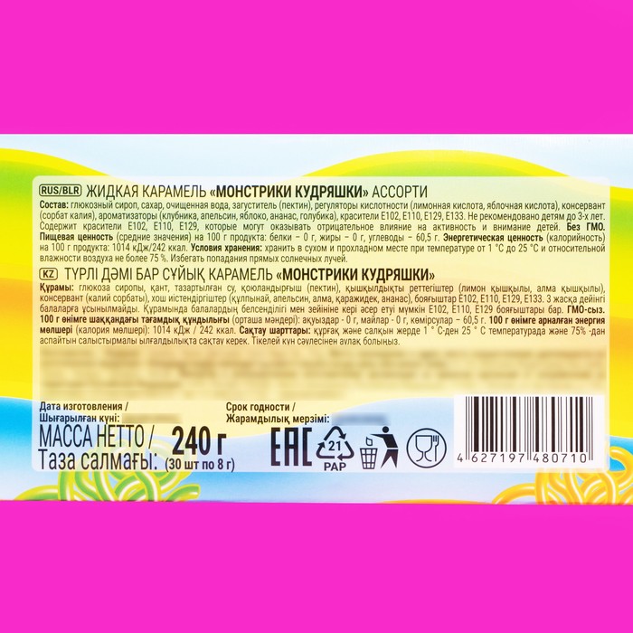 Сладость, которая привлекает одной своей упаковкой в виде кудрявых монстриков. Внутри каждого — жидкая карамель со вкусом клубники, голубики, ананаса, апельсина или яблока!