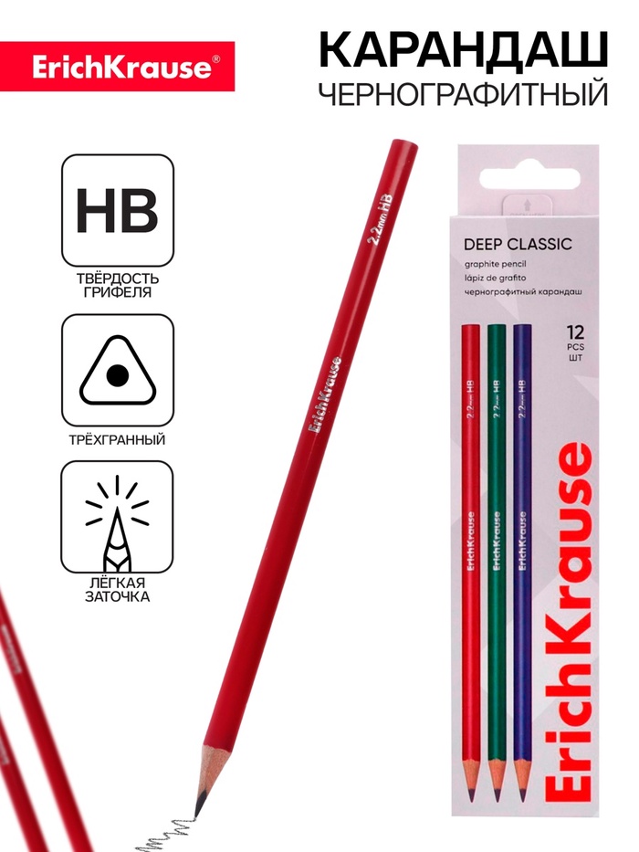 Карандаш чернографитных ErichKrause «Deep Classic triangular», НВ, грифель d=2.2 мм, дерево, трёхгранный, в тубусе, МИКС