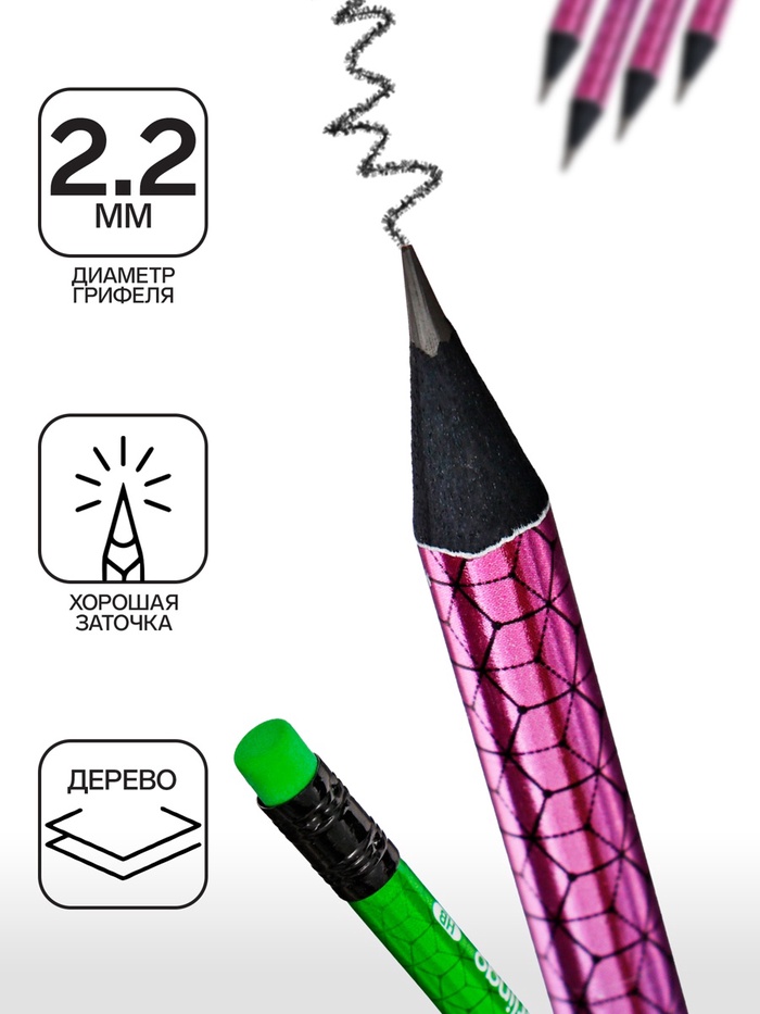 Чернографитный карандаш из черного дерева, с ластиком, с заточкой. Подходит для черчения и рисования. Диаметр грифеля 2,2мм, твердость HB, круглая форма, штрих-код на корпусе. Блестящая печать разноцветной фольгой на корпусе, 3 дизайна ассорти. Упаковка в тубу по 72шт.
