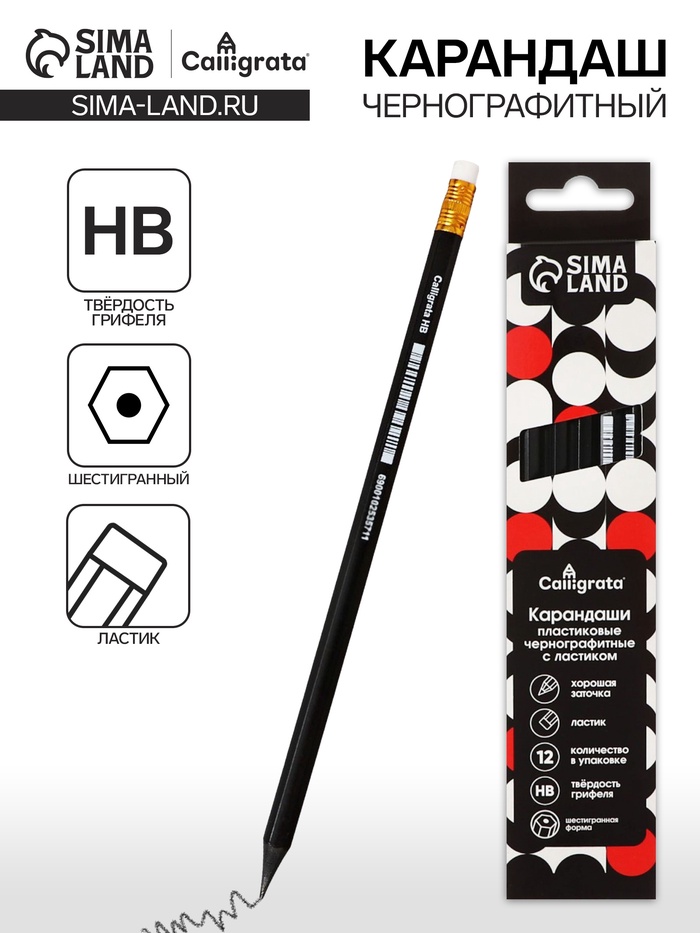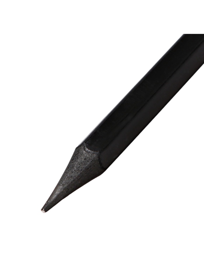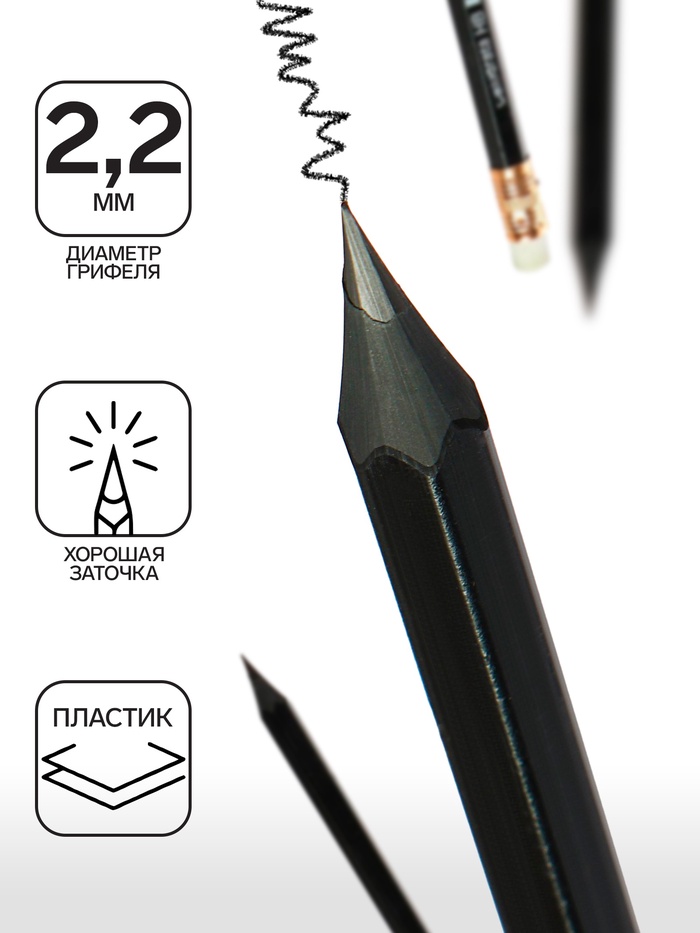 Карандаш изготовлен из прочного пластика. Ластик, расположенный в верхней части карандаша, обеспечивает удобное стирание. Благодаря шестигранному сечению корпуса карандаш удобен в работе и менее подвержен скатыванию с поверхности стола. Корпус длиной 189 мм не крошится. Грифель карандаша обладает средней степенью твердости – HB. Корпус выкрашен в классический черный цвет. Поставляется заточенным