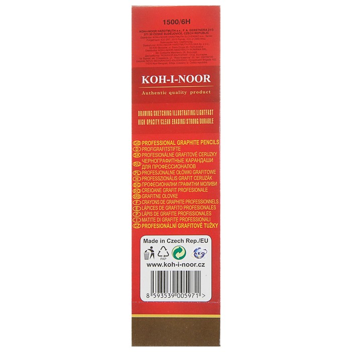 Профессиональный карандаш Koh-I-Noor серии 1500 - наиболее известная модель фабрики. Изготавливается компанией более 120 лет. Модель легко узнаваема благодаря неизменному жёлтому покрытию и позолоченной надписи. Грифель карандаша мягкий и прочный. Оставляет яркий и насыщенный след. Корпус изготовлен из прочной древесины. Это делает карандаш очень удобным при работе с чертежами, графикой и художественными рисунками.