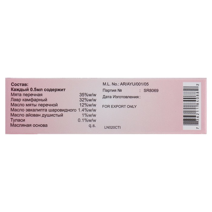 Состав: мята перечная, лавр камфарный, масло мяты перечной, масло эвкалипта шаровидного, масло айован душистый, масло туласи.