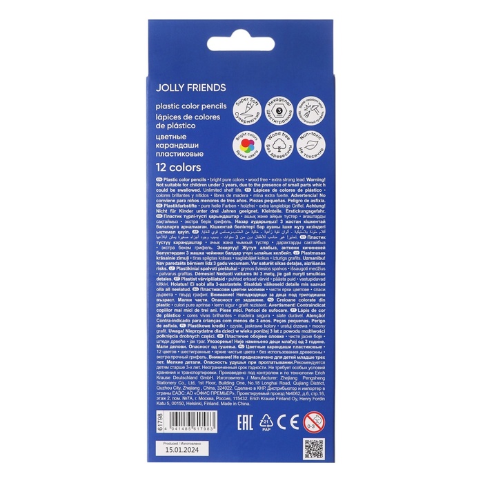 Пластиковые цветные карандаши ErichKrause представлены широкой палитрой оттенков, которые позволяют создавать яркие реалистичные рисунки. Регулируя силу нажима, можно контролировать насыщенность оттенков и плавность перехода цветов. Благодаря шестигранной форме, карандаши удобно лежат в руке и не скатываются с поверхности. Специальная технология изготовления карандаша методом экструзии надежно фиксирует грифель к корпусу, что обеспечивает высокую ударопрочность. Идеальная центровка грифеля и пластичность материала карандаша гарантируют легкую заточку с экономным расходом карандаша. Грифель диаметром 3 мм не царапает бумагу, не крошится при рисовании и не ломается даже при сильном нажатии. Европейский сертификат качества (СЕ) гарантирует отсутствие в составе токсичных веществ.