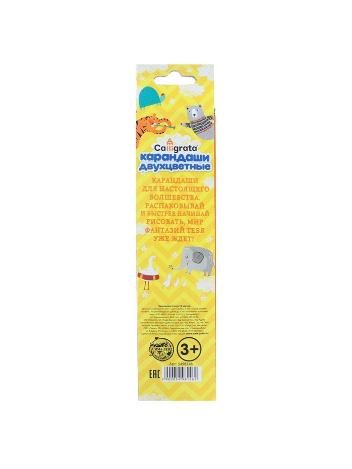 Набор состоит из 6 карандашей и 12 цветов.Треугольная форма сечения корпуса позволяет не скатываться карандашу с поверхности стола во время занятий рисованием.Они изготовлены из высокосортной древесины ценных пород и имеют лакированный корпус.Качество древесины и исполнения гарантируют легкую заточку.Грифель из натуральных материалов и пигментов обладает повышенной прочностью.Все карандаши заточены с двух сторон и поставляются в картонной упаковке с европодвесом.Цветные карандаши позволят юным художникам выразить свои мысли и эмоции в красивых рисунках.Способствуют развитию творческого мышления, мелкой моторики рук, цветового восприятия, фантазии и воображения ребенка.
