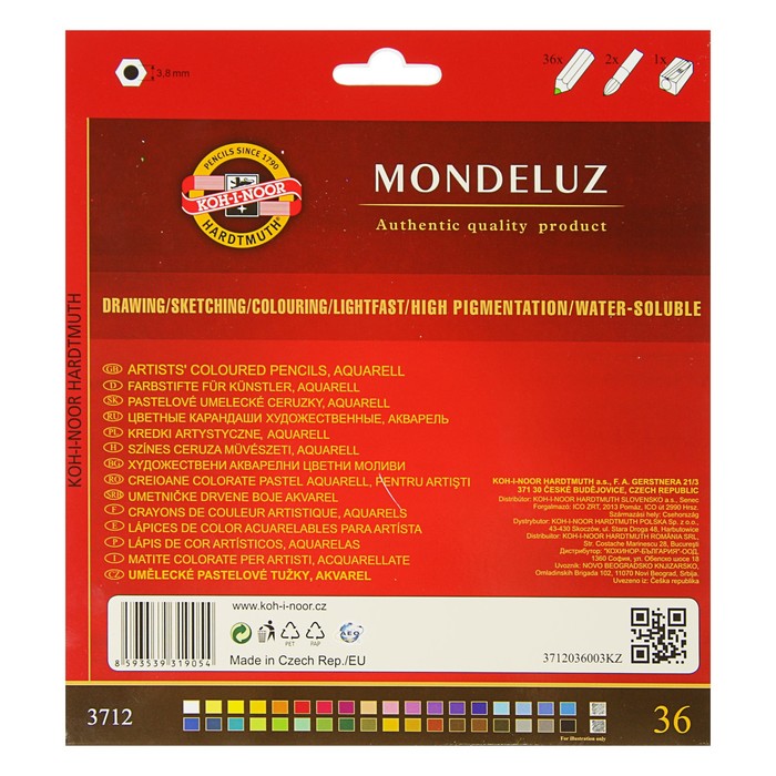 Акварельные карандаши Koh-I-Noor серии Mondeluz предназначены для профессиональных и начинающих художников. Карандаши оставляют яркие выразительные линии на поверхности, мягко пишут. Грифель легко затачивается. Следы не размываются водой и не выгорают на солнце. Корпус карандашей изготовлен из кедра специальной породы, что делает его прочным и удобным в использовании.