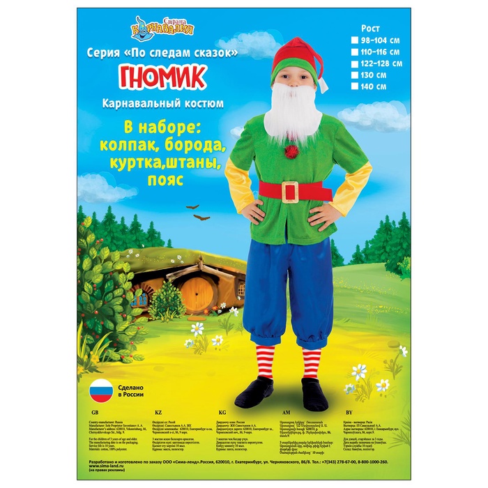 Карнавальный костюм детский «Гном зелёный», колпак, жакет, бриджи, борода, пояс, р. 28, рост 98-104 см