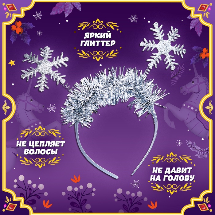 - Праздничный ободок — мишура и две блестящие снежинки на пружинках превратят обычный ободок в настоящий аксессуар для маленькой модницы.