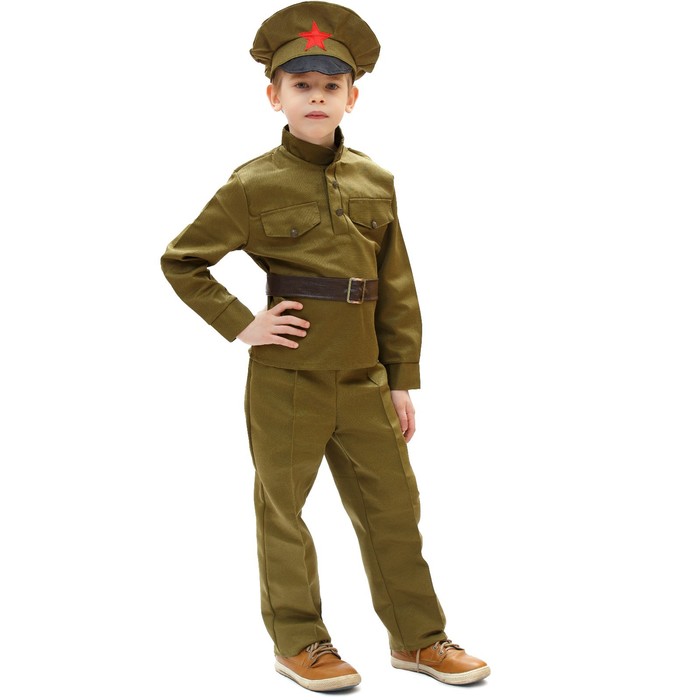 Карнавальный костюм «Сержант», 8–10 лет, рост 140–152 см поможет воспитать у ребёнка патриотические чувства. Стилизованная гимнастёрка и брюки прямого кроя в сочетании с красноармейской фуражкой — изюминкой любой формы — позволят мальчику с головой окунуться в атмосферу боевых дней. Комплект из полиэстера (80 %) в сочетании с хлопком (20 %) обеспечивает идеальную посадку и не будет сковывать движений.
