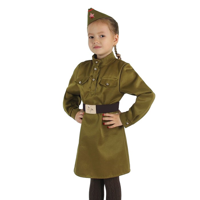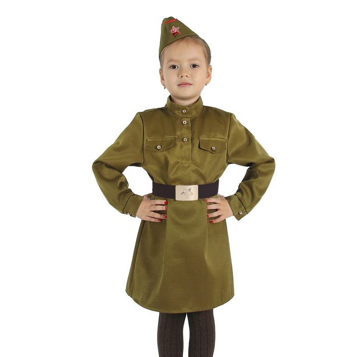 Карнавальный костюм военного для девочки, рост 152 см, р. 40 превратит юную леди в отважную военнослужащую! Платье стилизовано под военную форму времён Второй мировой войны. Высококачественный материал (хлопок 50 %, полиэстер 50 %) обеспечивает идеальную посадку и не сковывает движения. Танец, исполненный в таком платье, будет особенно трогательным. Костюм идеально подойдёт к любому военному празднику и поможет воспитать у девочки патриотические чувства.