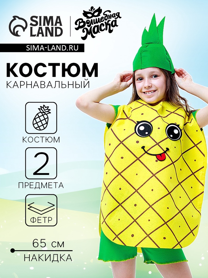 С набором «Задорный ананас» ваша малышка станет настоящей звездой на детской вечеринке и поразит всех гостей! С ним вы составите полноценный образ, ведь в комплекте есть накидка и головной убор. Создавайте яркие эмоции и воспоминания на целый год вперёд себе и ребёнку!