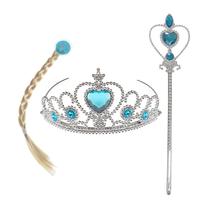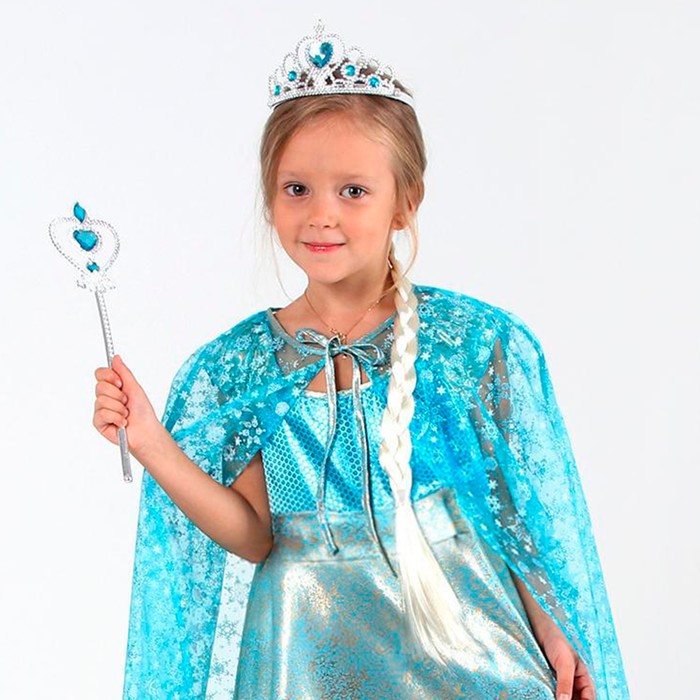 Набор «Холодное сердце» включает в себя белую косу, жезл и корону, благодаря чему можно создать завершённый образ героини из любимого мультфильма. Белая коса длиной 54 см, жезл и корона изготовлены из плотного пластика, который обеспечивает долговечность и комфорт при ношении.