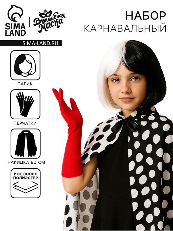 Карнавальный набор для создания образа «Злодейки Де Виль» — идеальный выбор для детского праздника, особенно на Хэллоуин. В комплект входят все ключевые элементы, чтобы ребенок мог перевоплотиться в яркую и узнаваемую героиню: накидка, черно-белый парик и элегантные перчатки.