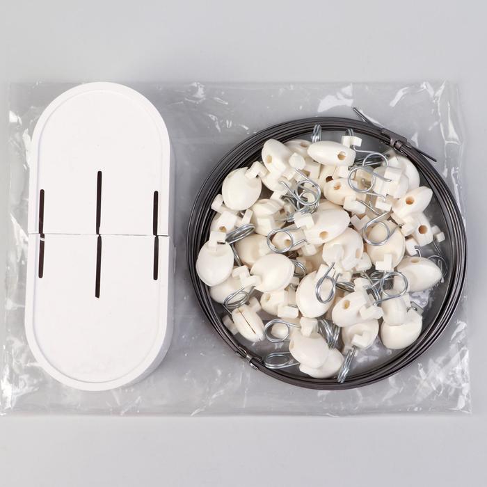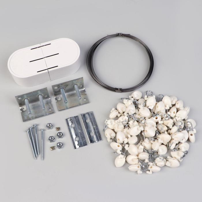 Струнный карниз состоит из металлической струны и кронштейнов, которые крепятся на потолок. Тросовый карниз применяется для лёгких штор и тюля. В комплект входят крепления и зажимы для штор. Струну можно обрезать до любой необходимой длины.
