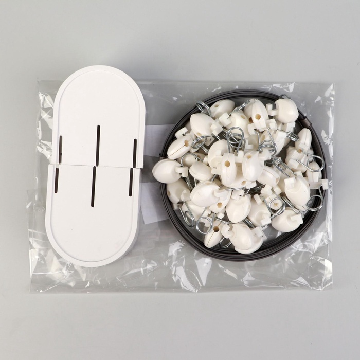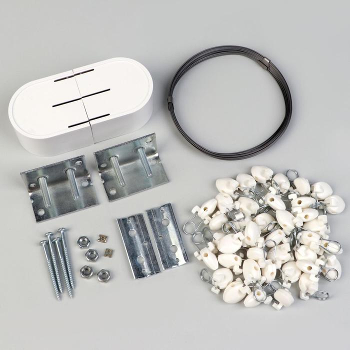 Струнный карниз состоит из металлической струны и кронштейнов, которые крепятся на потолок. Тросовый карниз применяется для лёгких штор и тюля. В комплект входят крепления и зажимы для штор. Струну можно обрезать до любой необходимой длины.