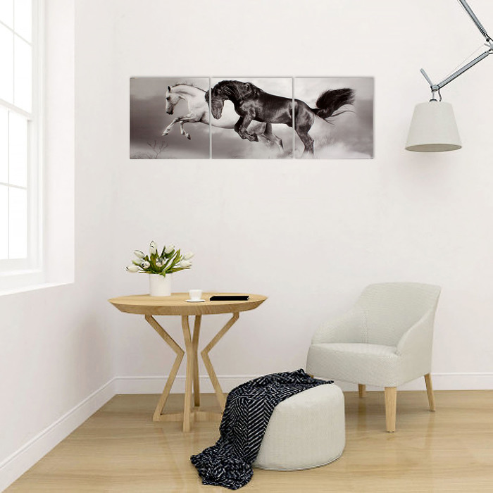 Картина модульная на подрамнике "Скакуны. Черный, белый." 3шт-50х50 см; 50*150 см визуально расширит пространство. Это идеальное решение для небольших комнат, коридоров и холлов.
