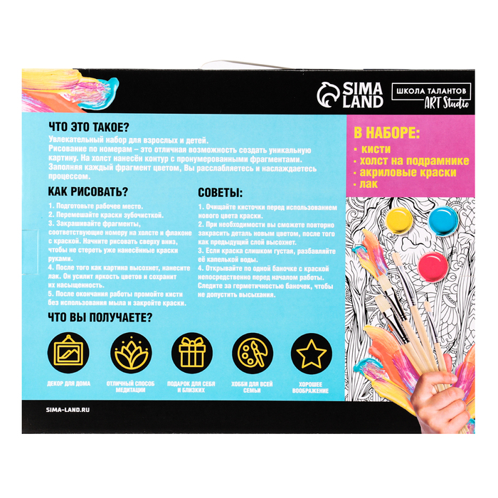Картина по номерам - это холст, который разделён на множество мелких фрагментов, на каждом из которых указано число, соответствующее цвету, которым нужно закрасить данный участок. Простота и удобство в использовании делают этот набор идеальным выбором для всех, кто хочет попробовать себя в живописи.