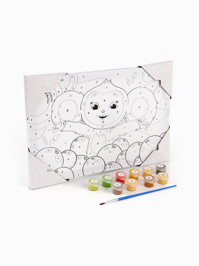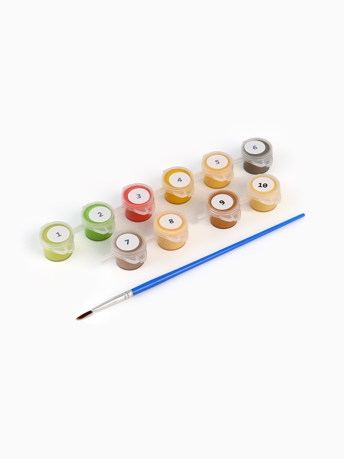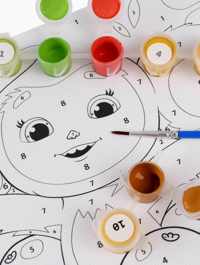 На холст нанесена схема, где пронумерован каждый сектор. Номер — цвет, написанный на баночке с краской. Нужно только раскрасить каждый сектор в соответствующий цвет.