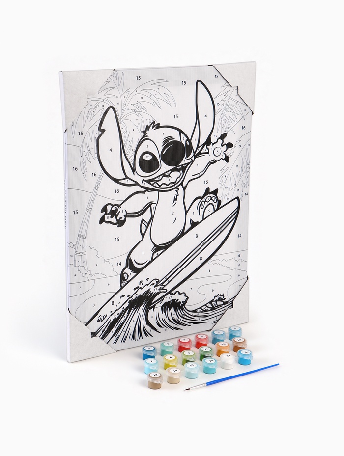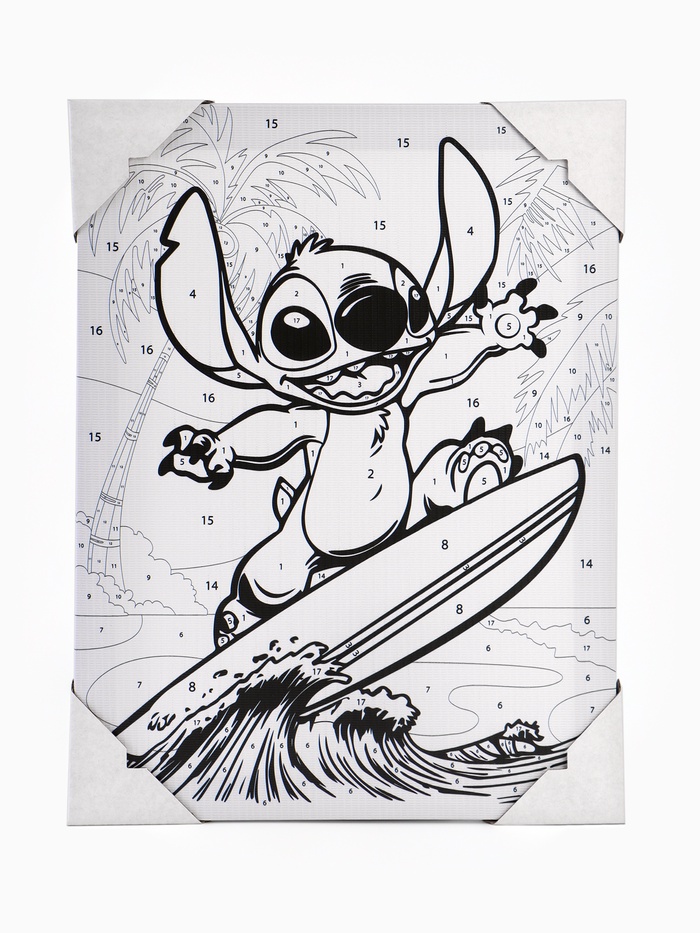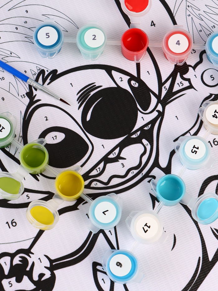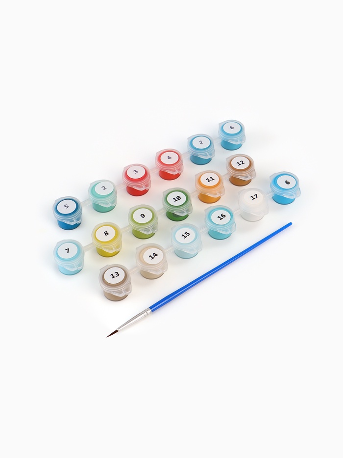 На холст нанесена схема, где пронумерован каждый сектор. Номер — цвет, написанный на баночке с краской. Нужно только раскрасить каждый сектор в соответствующий цвет.