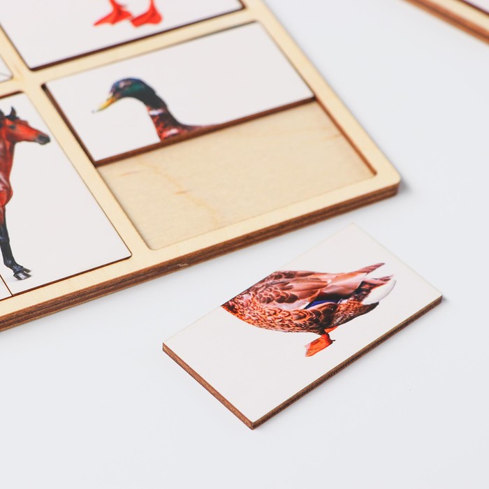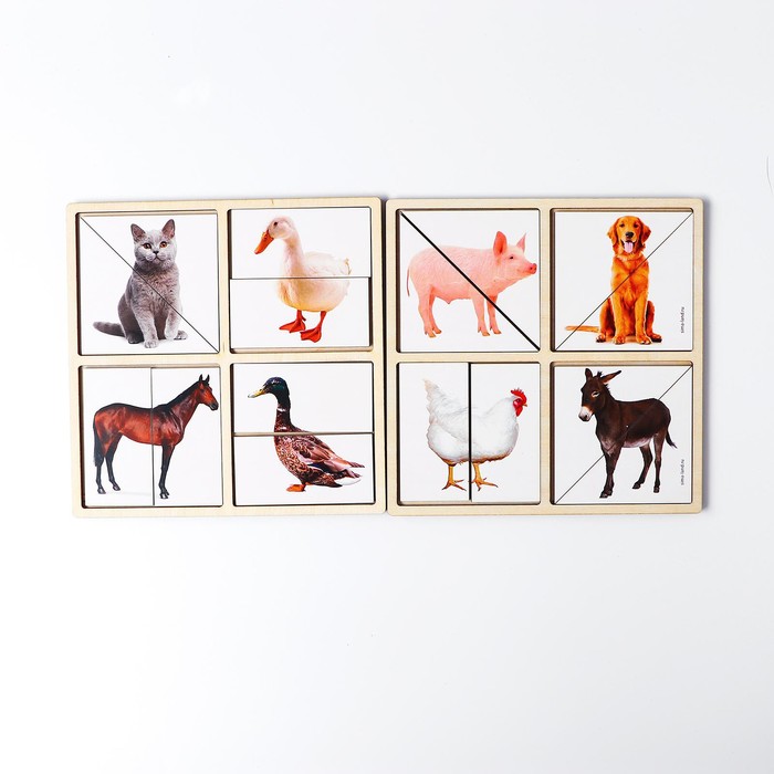 Для начала дайте ребёнку взглянуть на собранные картинки. Попросите назвать кто/что изображено на каждой картинке. Затем можно вынуть по одной детали от картинки и перемешать. Попросите малыша соединить половинки. Далее достаньте уже все детали и перемешайте.