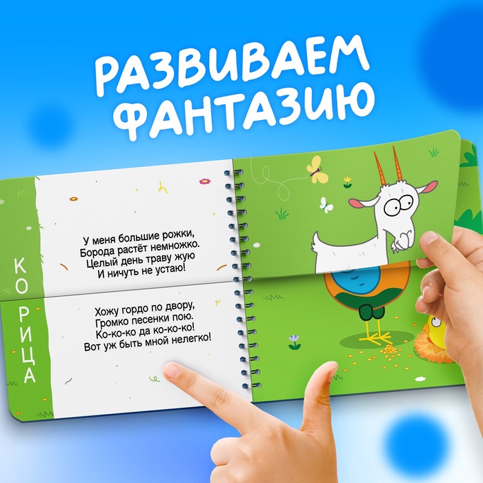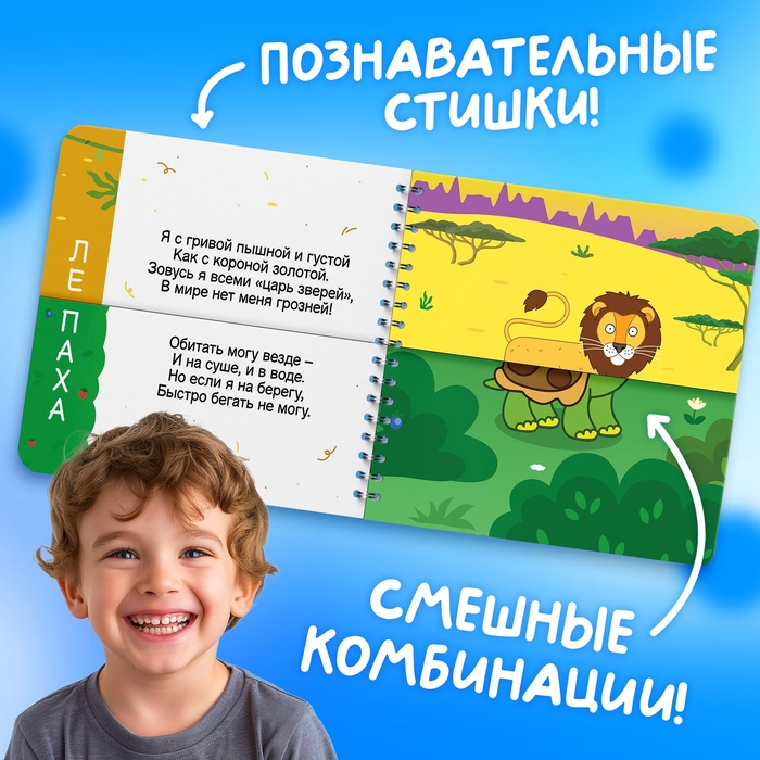 - Книга держится на пружинке, поэтому можно комбинировать самых разных животных, у которых уже придумано причудливое название. Например: козёл + курица = корица, лев + черепаха = лепаха и т. п.