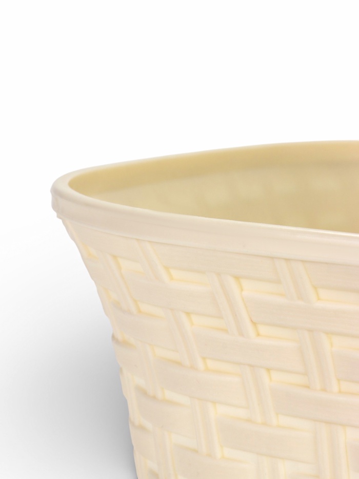- Текстура под натуральный ротанг: рельефная поверхность точно имитирует плетение. Этот дизайнерский штрих делает кашпо самодостаточным элементом декора.