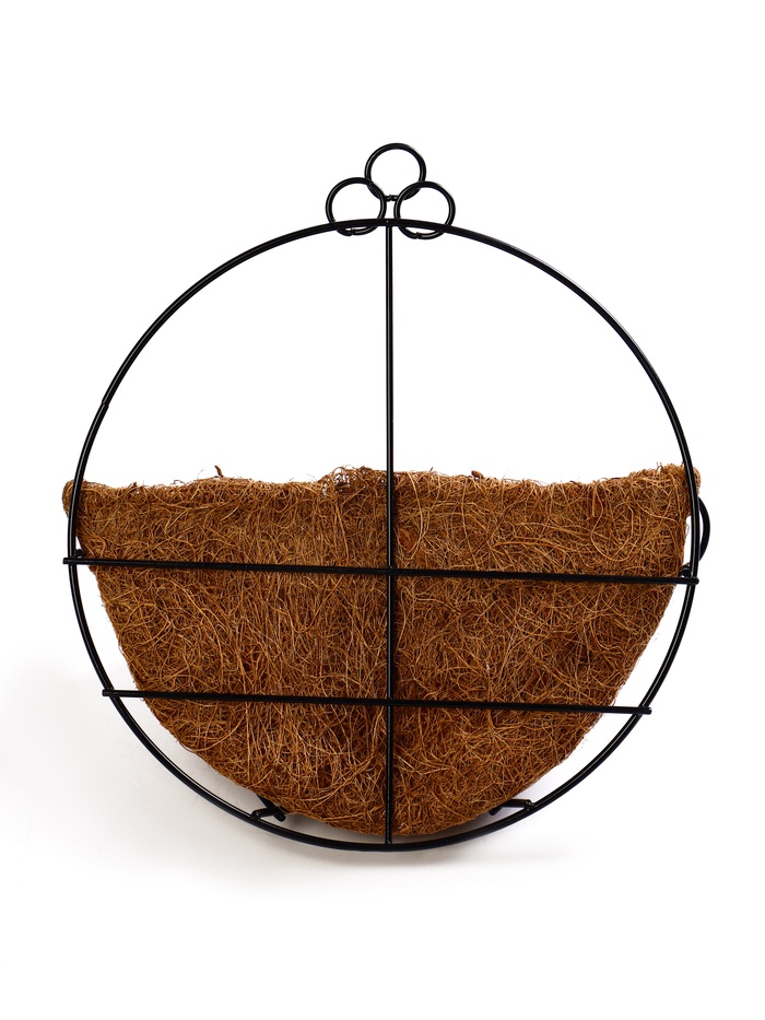 Эстетика и функциональность: строгий металлический контур сочетается с фактурой натурального кокоса. Такое кашпо подчеркивает красоту растения, не отвлекая на себя внимание. Закрытое дно защищает поверхность стены от влаги после полива.