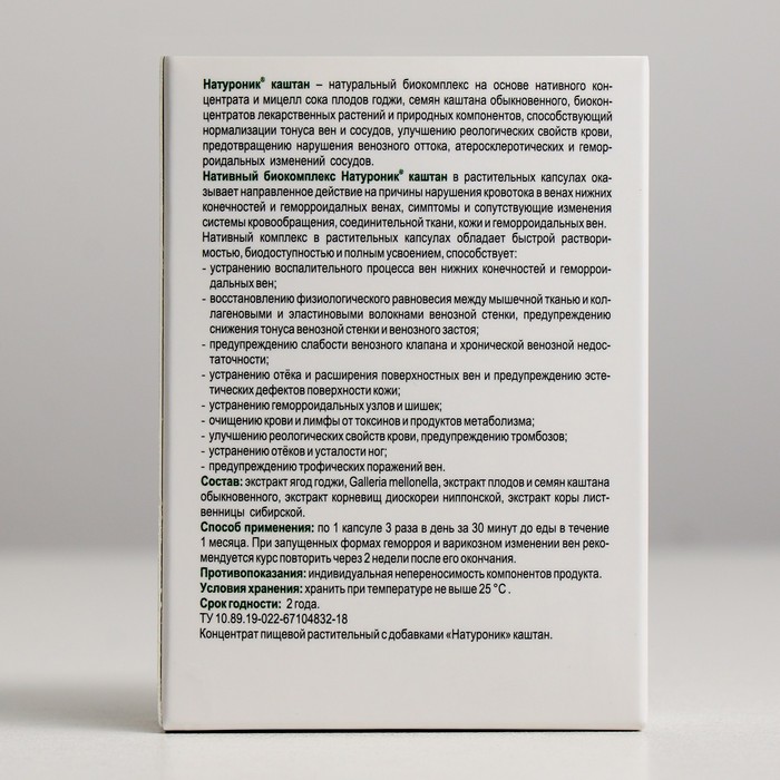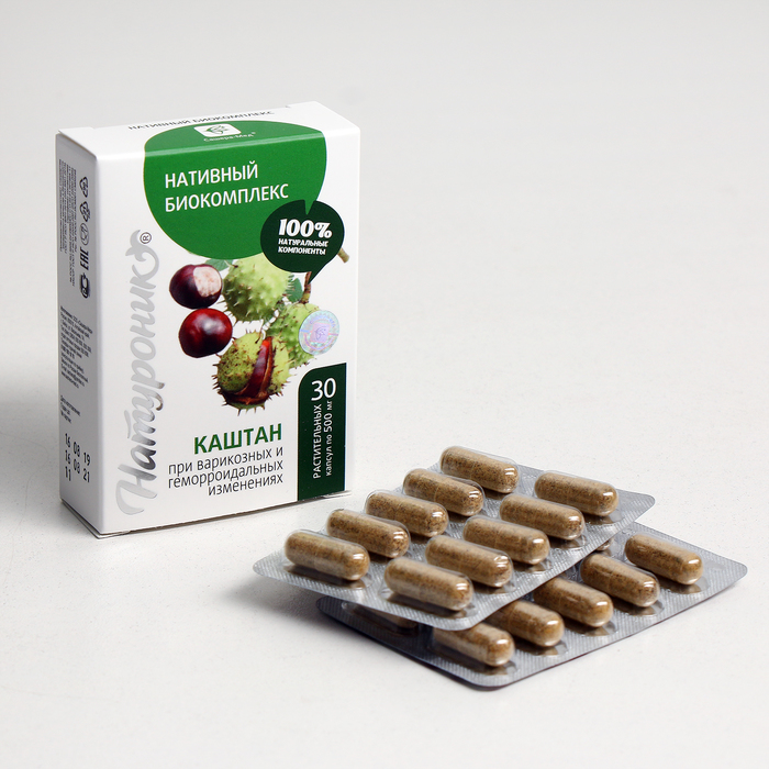 Нативный биокомплекс Натуроник® каштан в растительных капсулах оказывает направленное действие на причины нарушения кровотока в венах нижних конечностей и геморроидалных венах, симптомы и сопутствующие изменения системы кровообращения, соединительной ткани, кожи и геморроидальных вен.