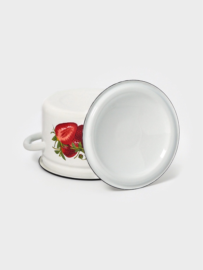 - Белая эмаль с рисунком: светлый фон помогает контролировать процесс варки и визуально увеличивает объём. Неброский декор добавляет уют, не нарушая гладкости поверхности — грязь не скапливается в углублениях.