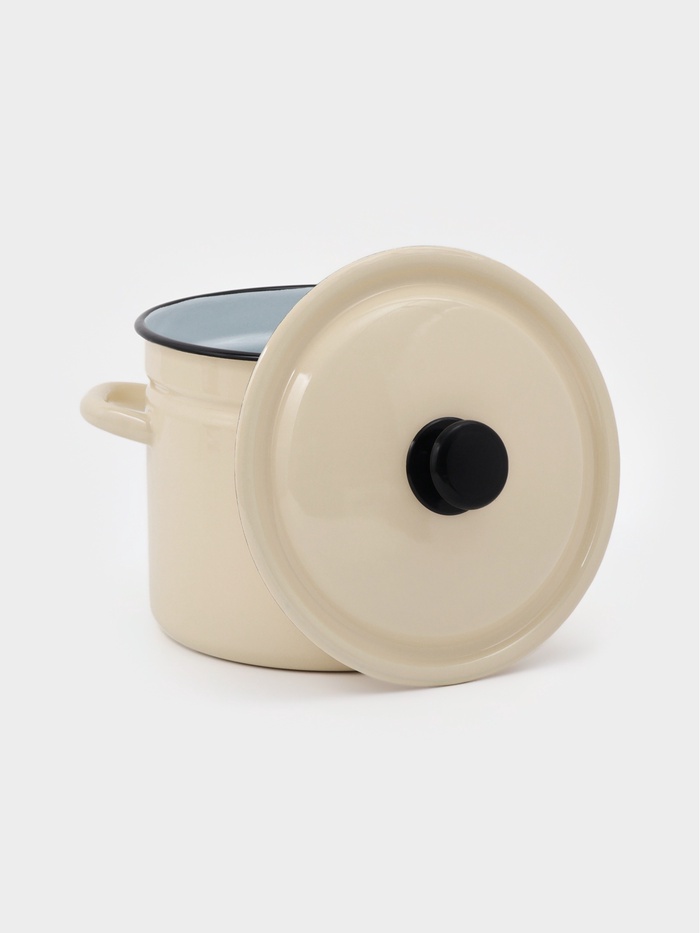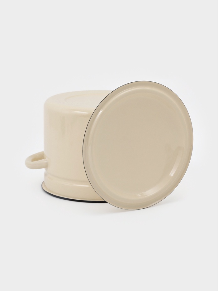 Цвет слоновой кости, гладкая поверхность без рисунка и крышка из той же эмалированной стали делают её практичной в использовании и простой в уходе.
