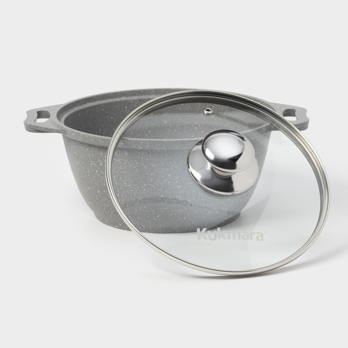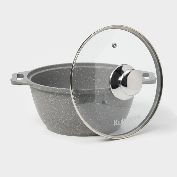 Кастрюля Kukmara сделана из литого алюминия. Имеет инновационное антипригарное мраморное покрытие на водной основе, которое изготовлено по немецкой технологии (Weilburger Coatings GmbH) и усилено сверхтвёрдыми частицами минералов.
