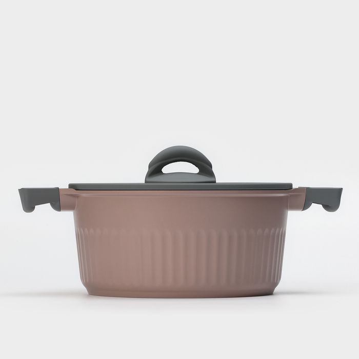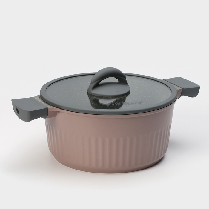 Изящная крышка из жаропрочного стекла с защитным ободком приятного цвета, удобной, не нагревающейся бакелитовой ручкой создает герметичную атмосферу внутри. Кроме этого по краям посуды имеются две эргономичные бакелитовые ручки серого цвета с нескользящим покрытием soft-touch.