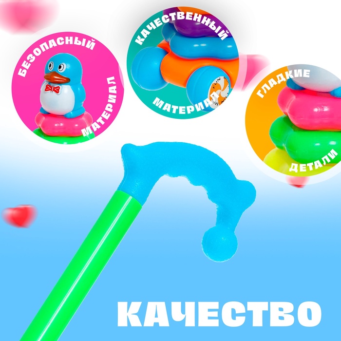 - На палке — ребёнок сможет толкать игрушку, укрепляя мышцы и координацию движений.