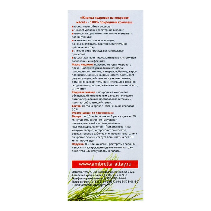 «Живица кедровая на кедровом масле» — 100%-ый природный комплекс.