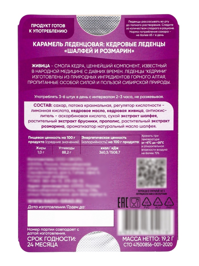 Продукт упакован в удобный блистер на 6 леденцов, что позволяет брать их с собой в дорогу, на работу или учебу. Кедровые леденцы Kedrini всегда под рукой для поддержания горла здоровым и свежим.
