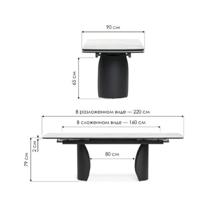Керамический стол Готланд белый мрамор/черный металл, черный 90x160(220)x79 см