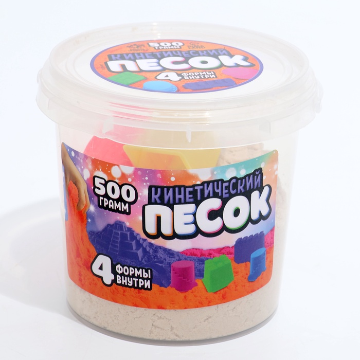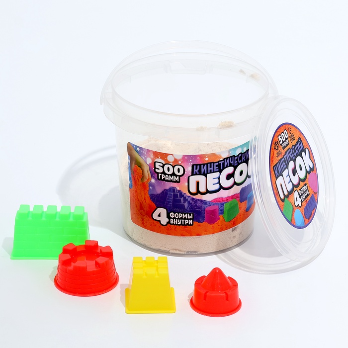 - В комплекте с песком в ведёрке идут 4 формочки для лепки.
