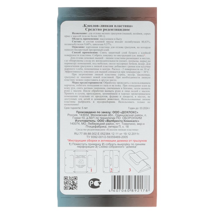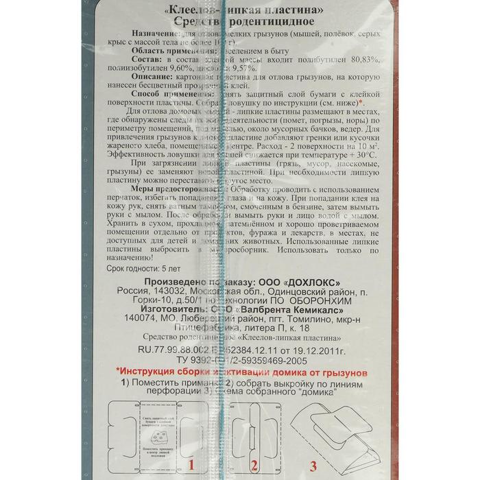 Ловушка представляет собой картонный домик со входами для грызунов с двух сторон и полом в виде клейкой пластины. Для использования домик нужно сложить по линиям сгиба и снять защитный слой с липкой основы. Установить в укромном месте на линии передвижения вредителей.