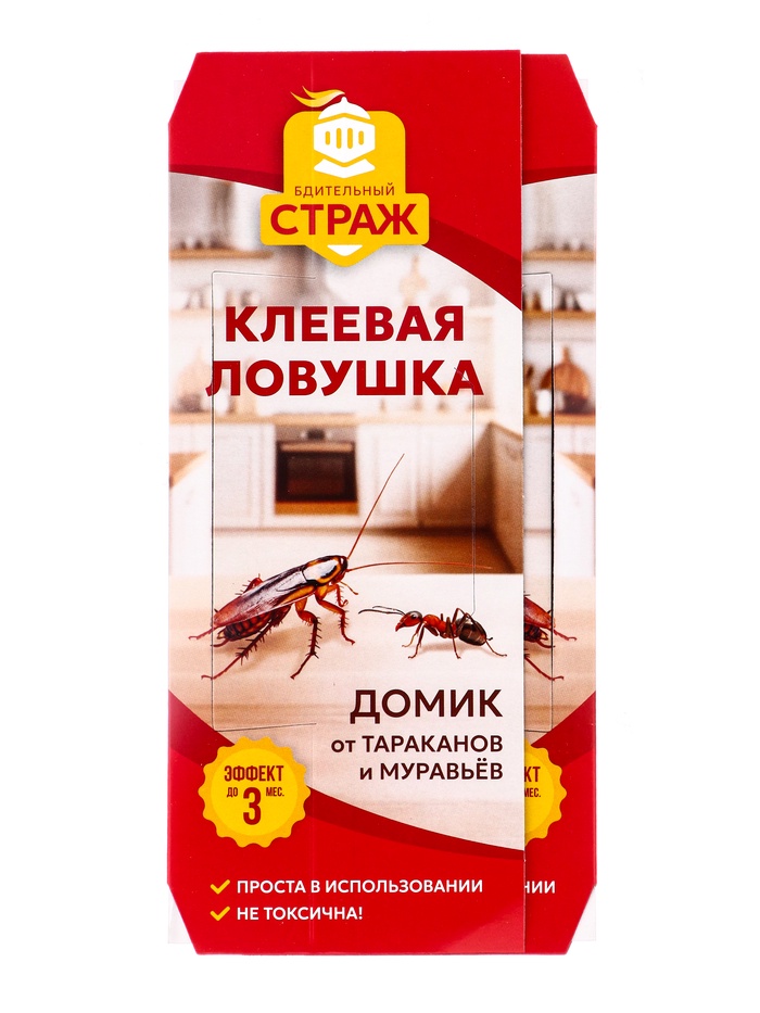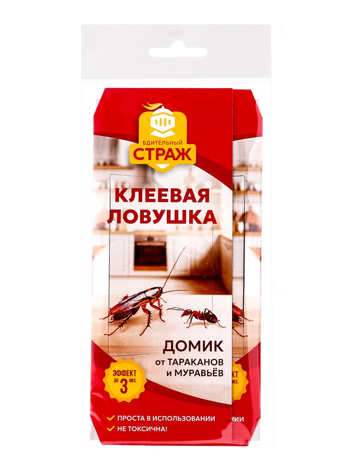 Бдительный страж клеевая ловушка от тараканов и муравьев, домик с приманкой аттракантом. Абсолютно безвредно для человека и домашних животных, не оказывает раздражающего воздействия на кожу. Клеевые ловушки Бдительный Страж просты в применении и могут быть установлены в любом месте, в том числе в местах хранения пищевых продуктов. Вскрытые ловушки сохраняют активность в течении трех месяцев.ПРЕИМУЩЕСТВАКлей сильной фиксацииВлагостойкий картонСОСТАВСодержит в своем составе: каучук - 52%, производные поли-изобутилена - 25%, аттрактант пищевой - 3% и масло минеральное до 100%. Не содержит токсических веществ.СПОСОБ ПРИМЕНЕНИЯАккуратно открыть ловушку и отделить бумагу, закрывающую клей.С помощью клапана для фиксации сомкните замок.Установите ловушку вблизи стен, узких проемах.Для достижения лучшего результата рекомендуется использовать несколько ловушек одновременно. Ежедневно осматривайте ловушки - для своевременной утилизации.