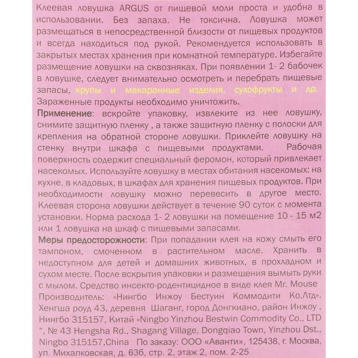 Описание:Ловушка от пищевой моли 2шт , размер (96мм*158мм) с аттрактантом.Способ применения:Вскройте упаковку, извлеките из нее ловушку, снимите защитную полоску на обратной стороне. Приклейте ловушку на стену внутри шкафа с пищевыми продуктами. Рабочая поверхность липкая сторона внутри ловушки содержит специальный феромон, который привлекает насекомых. используйте ловушку в местах обитания насекомых: на кухне, в кладовых, в шкафах для хранения пищевых продуктов. При необходимости ловушку можно перевесить в другое место. Клеевая сторона ловушки действует в течении 90 суток с момента установки. Норма расхода 1 - 2 ловушки на помещение 10 - 15 кв/м или 1 ловушка на шкаф с пищевыми запасами.Рекомендуется использовать в закрытых местах хранения при комнатной температуре. Избегайте размещения ловушки на сквозняках. При появлении 1 - 2 бабочек в ловушке, следует внимательно осмотреть и перебрать пищевые запасы, крупы, макаронные изделия, сухофрукты и др. Зараженные продукты необходимо уничтожить. Состав: каучук (52 %), производные полиизобутилена (25 %), пищевой аттрактант (3 %), масло минеральное (20 %).