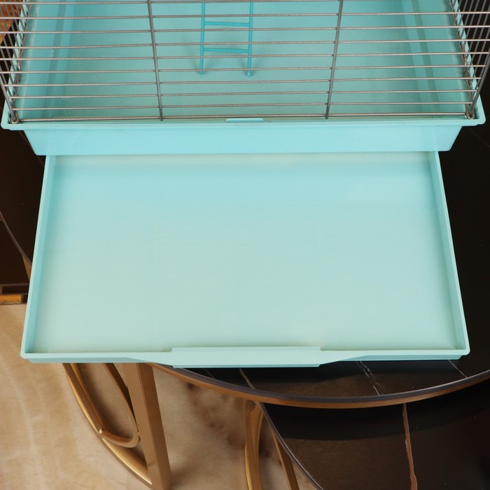 Кроме того, клетка оборудована удобной ручкой на крыше, облегчающей процесс переноски изделия, и специальным пластиковым выдвижным поддоном, облегчающим процесс уборки.