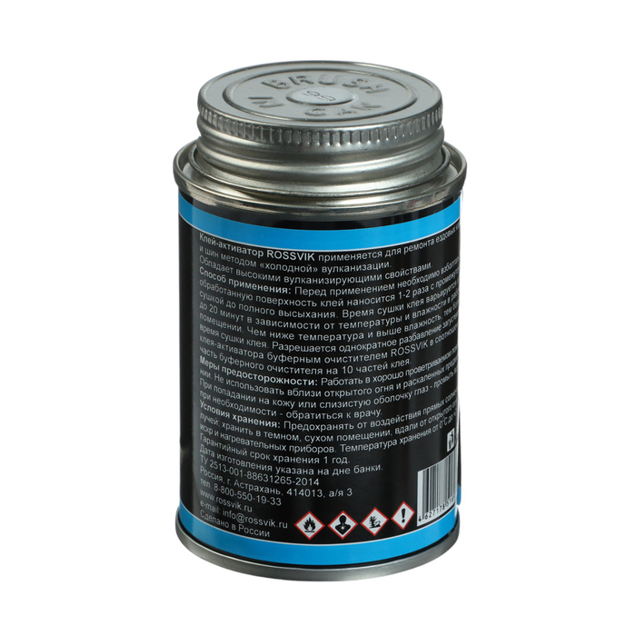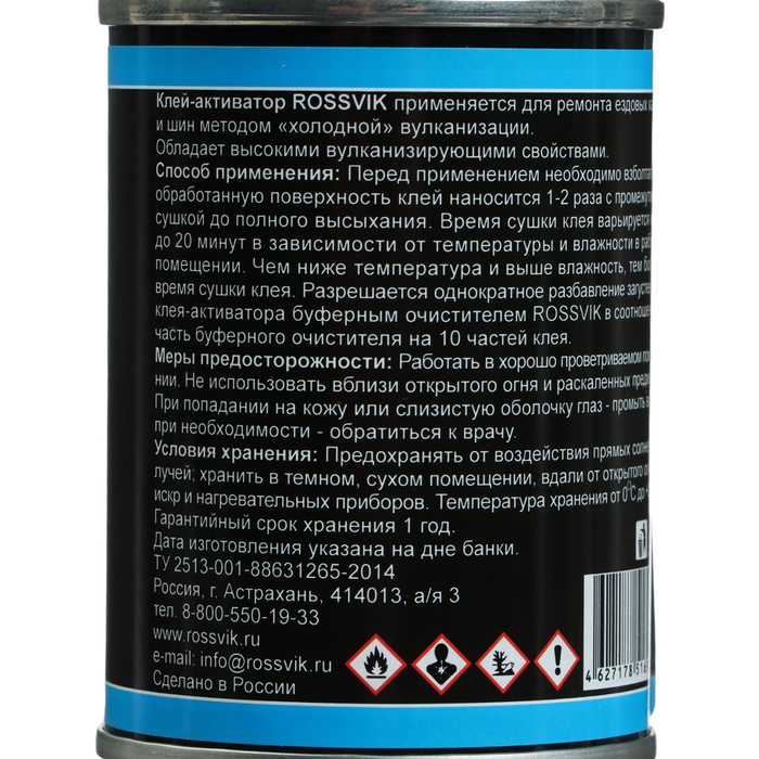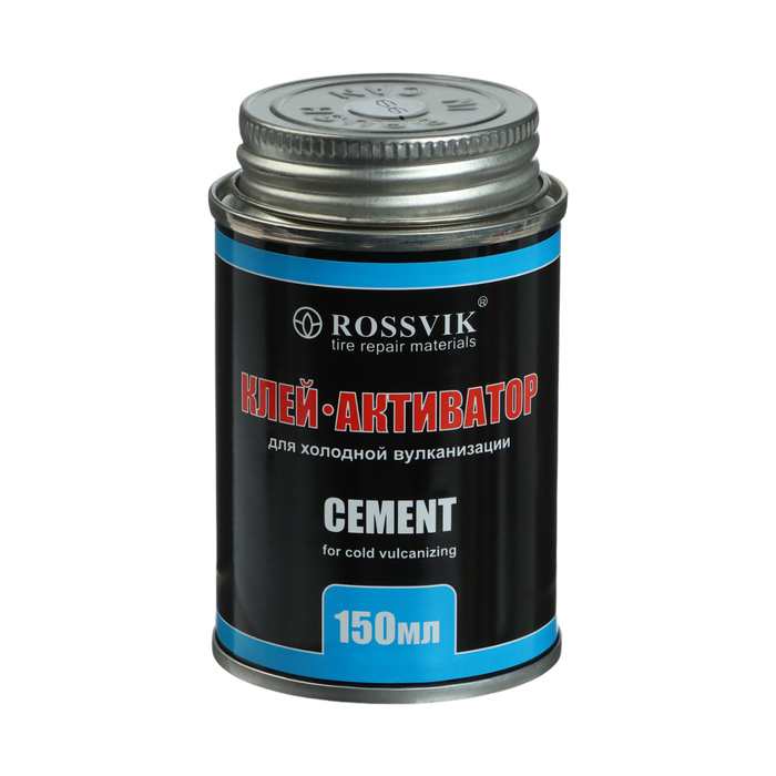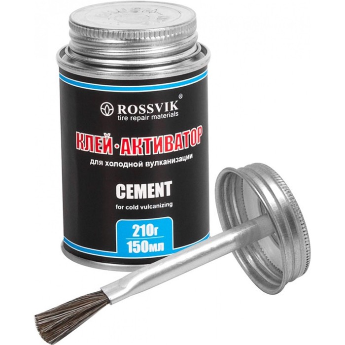 Клей - активатор, 500мл/680г (банка с кистью) Универсальный клей-активатор ROSSVIK применяется для ремонта камер и шин латками, грибками, жгутами и кордовыми пластырями методом “холодной” вулканизации. Состав негорючий, термостойкий, быстросохнущий. Содержит активаторы “холодной” вулканизации резины.