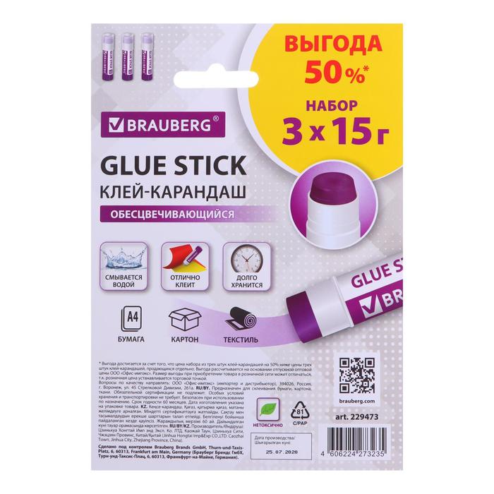 Обесцвечивающийся клей-карандаш BRAUBERG гарантирует надежное склеивание бумаги, картона и фотобумаги. Идеально подходит для офиса, дома и школы. Единица товара - блистер (15 г х 3 тубы). Выгодный формат!Обесцвечивающийся фиолетовый пигмент позволяет аккуратно наносить клей на поверхность, затем исчезает без следов. Легко наносится и распределяется по поверхности, оставляя тонкий и ровный клеевой слой, что позволяет расходовать его экономично. Клей удобен в использовании. Он не пачкает руки, стол, одежду, не попадает на участки бумаги, расположенные возле места склеивания. После нанесения высыхает без образования пятен. Не токсичен, не вызывает аллергии и безопасен для здоровья. Увеличенный срок годности — 5 лет.