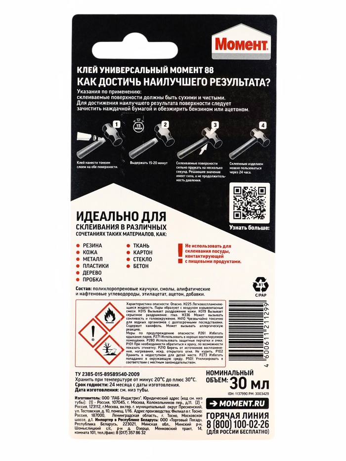 Уникальная формула клея обеспечивает повышенную прочность клеевого соединения. Предназначен для склеивания резины, кожи, металлов, полистирола, оргстекла и других пластиков, пробки, стекла, керамики, бетона. Не подходит для склеивания посуды, контактирующей с пищей, стиропора, полиэтилена и полипропилена.